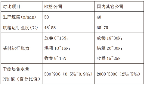 5、以陶瓷隔膜應用案例對比分析:在同等生產工藝條件下:水性陶瓷涂料,含固量40%,粘度80Cps,涂層干量4um。與國內同等設備相比,主要參數對比表如下: